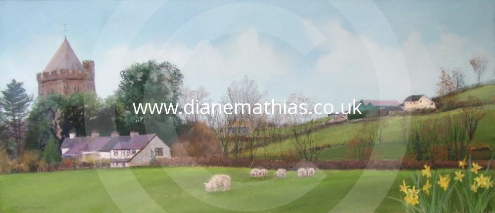 spring, sheep, lambs, daffodils, church, Teifi valley