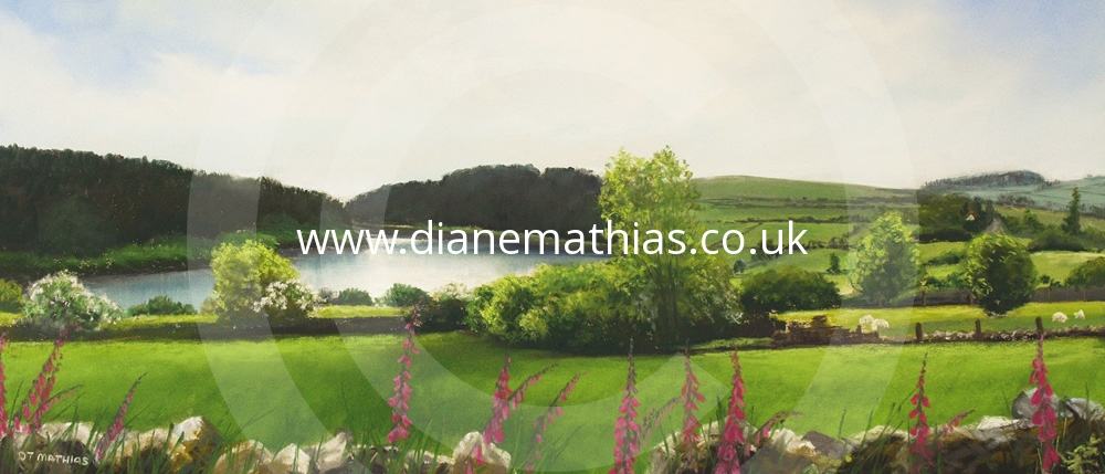 lake,foxgloves, wild flowers, stone wall, summer, Preseli mountains, farmland