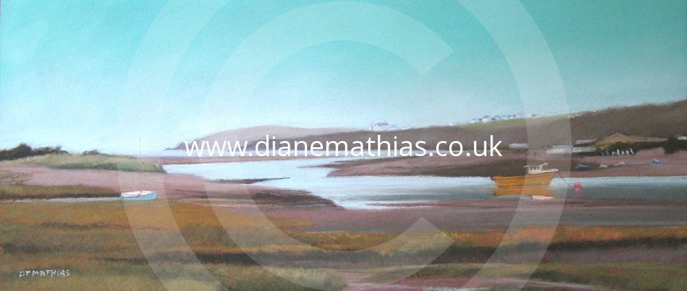 river Teifi, Teifi estuary, blue sky, boat, coastline, blue water